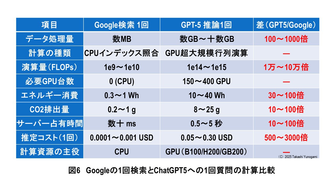 Google1回の検索とChatGPT1回の推論の演算量を比較してみると、何と1万~10万倍も違うのである。