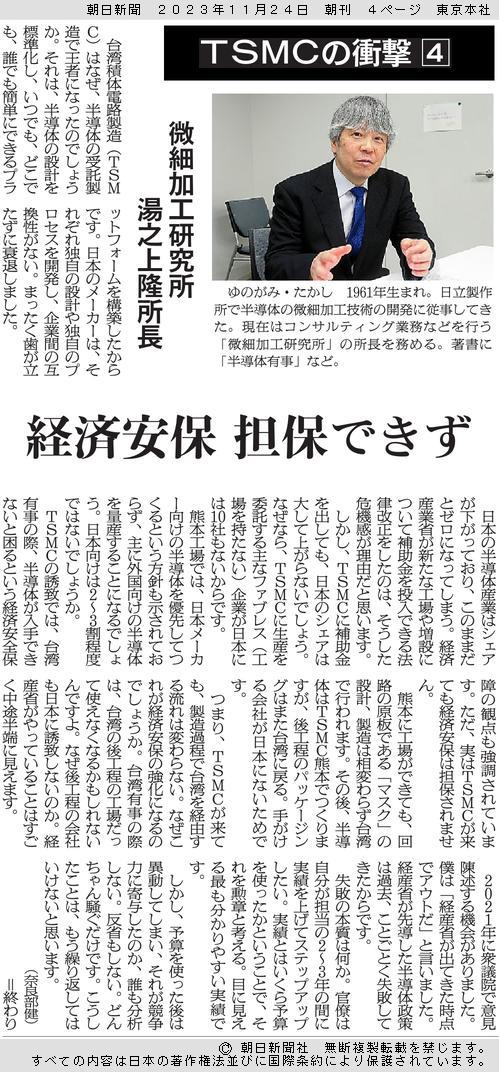 朝日新聞(2023/11/24)のコラム『TSMCの衝撃④』に筆者のインタビューが掲載されました。朝日新聞によれば、大きな反響があったとのことです。