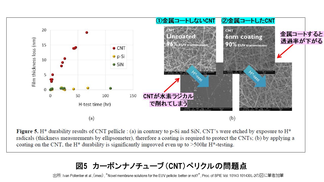 ペリクルとはレチクル(マスク)を保護する薄膜で、EUV露光装置用としては、カーボンナノチューブ(CNT)製が有望視されています。しかし、CNTは、露光装置内の水素ラジカルに削られてスカスカになってしまいます。水素ラジカルのアタックを防止するために、CNTに金属をコートする手法が考案されましたが、そうするとEUVの透過率が下がります。