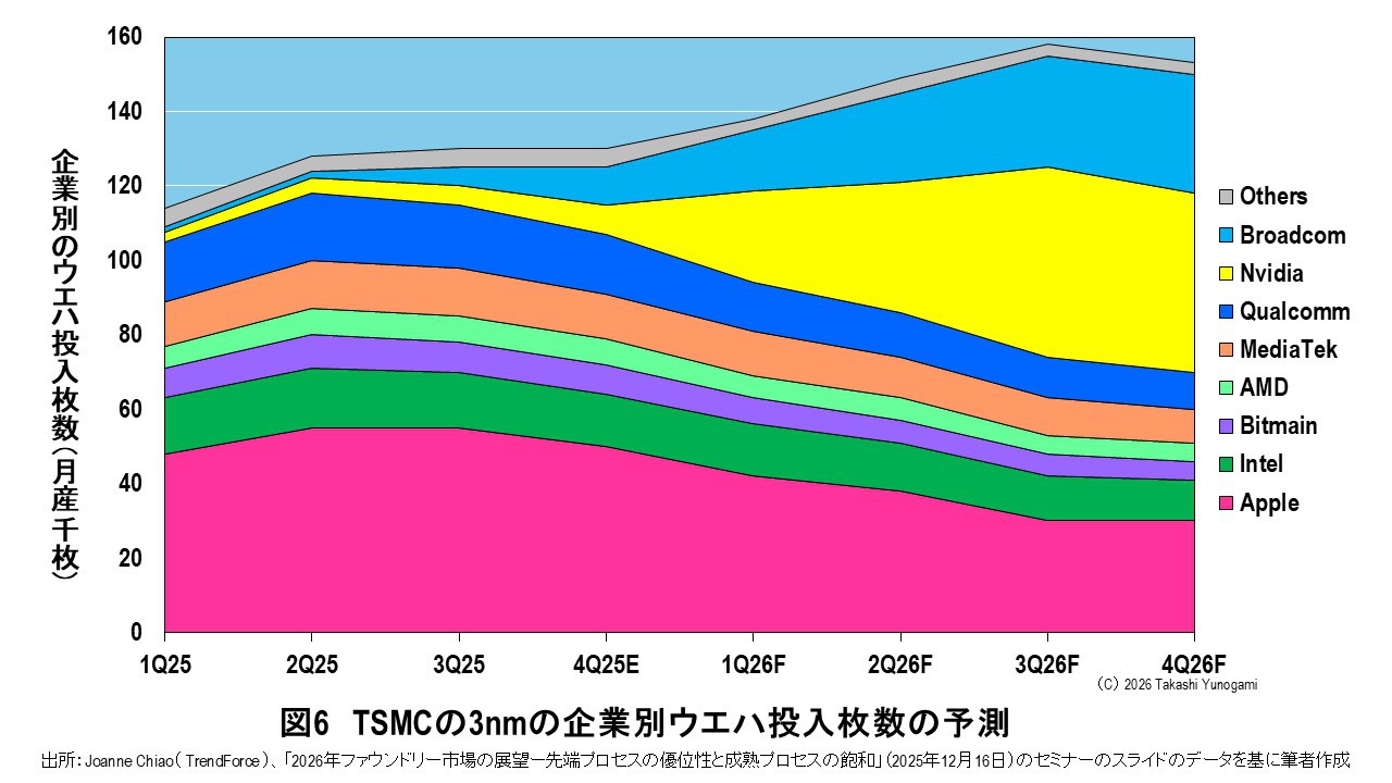 TSMCは2025年Q4に2nmの量産を開始した。しかし、今年2026年に最も稼ぐのは3nmだろう。その3nmにおいて、どのファブレスが、どれだけのウエハを確保するのか。