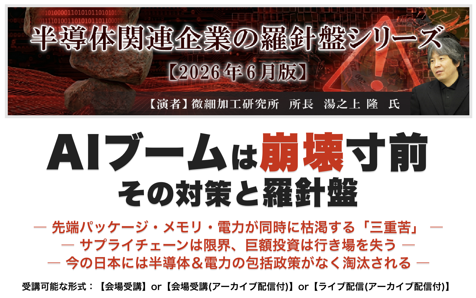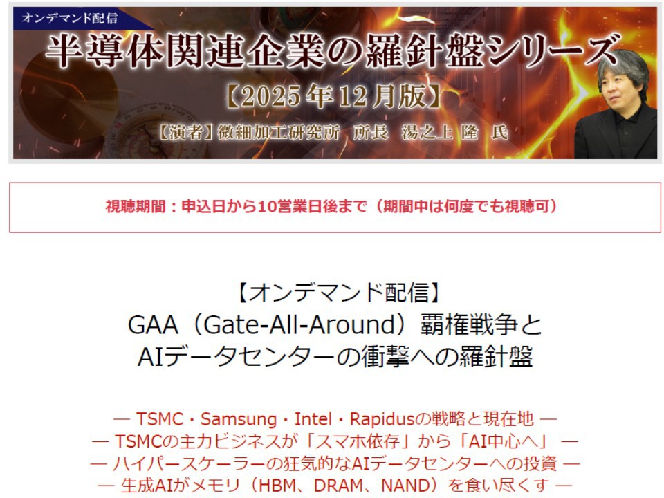 2025年12月に行ったサイエンス&テクノロジー主催のセミナー『GAA覇権戦争とAIデータセンターの衝撃への羅針盤』のオンデマンド配信を開始しました。