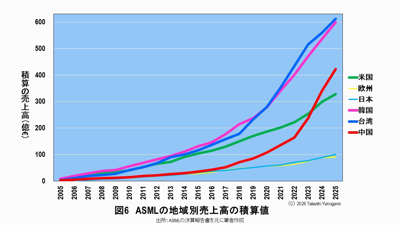 露光装置市場を独占しているASMLについて、2005年から2025年までの地域別売上高の積算値をグラフにしてみました。このグラフは何を意味しているのでしょうか?